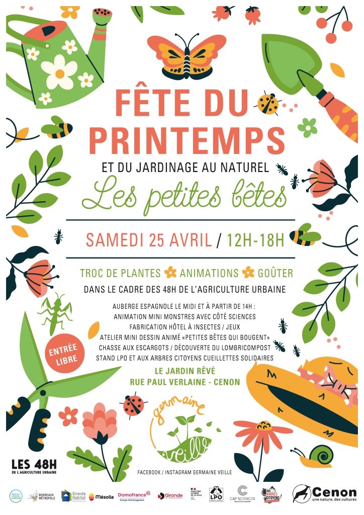 - de 12h à 18h; le Jardin Rêvé de Germaine Veille à Cenon fête le printemps (auberge espagnole, troc de plantes, animations, ateliers, goûter…)