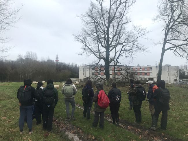 Les étudiants ont commencé par arpenter, sous la pluie, le parc Palmer et la résidence Beausite (photo) à Cenon. Nous leur avons ainsi présenté, in situ, les différentes actions de gestion écologique menées par les équipes du GPV, de la Ville de Cenon et de Bordeaux Métropole : fauche avec exportation, gestion du bois mort, régénération des boisements, parcelles à l’étude pour le pâturage.
