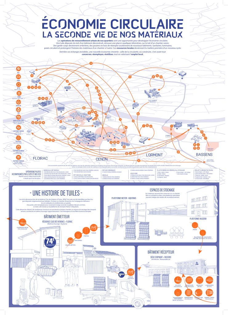Ce poster met également en lumière ce qui fait la force de la démarche d’économie circulaire : l’engagement collectif. Elle est le fruit d’un partenariat local très large mobilisant : maîtres d’ouvrage, bailleurs, collectivités, entreprises du BTP, bureaux d’études, artisans, associations…