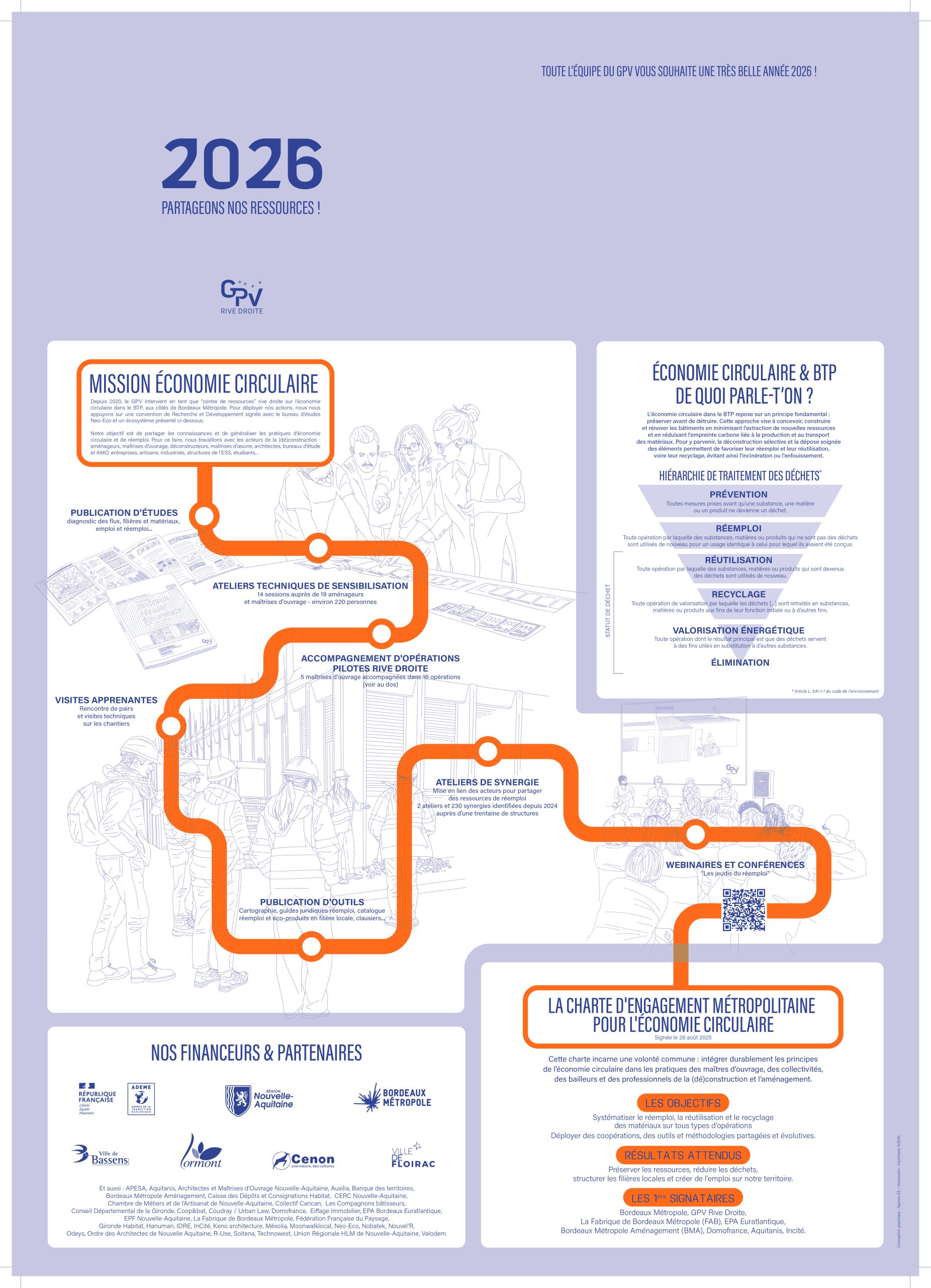 À l’occasion de la nouvelle année, le GPV Rive Droite a le plaisir de vous présenter ses vœux 2026 sous une forme originale : un poster illustré qui raconte l’histoire de l’économie circulaire des matériaux de construction sur notre territoire.