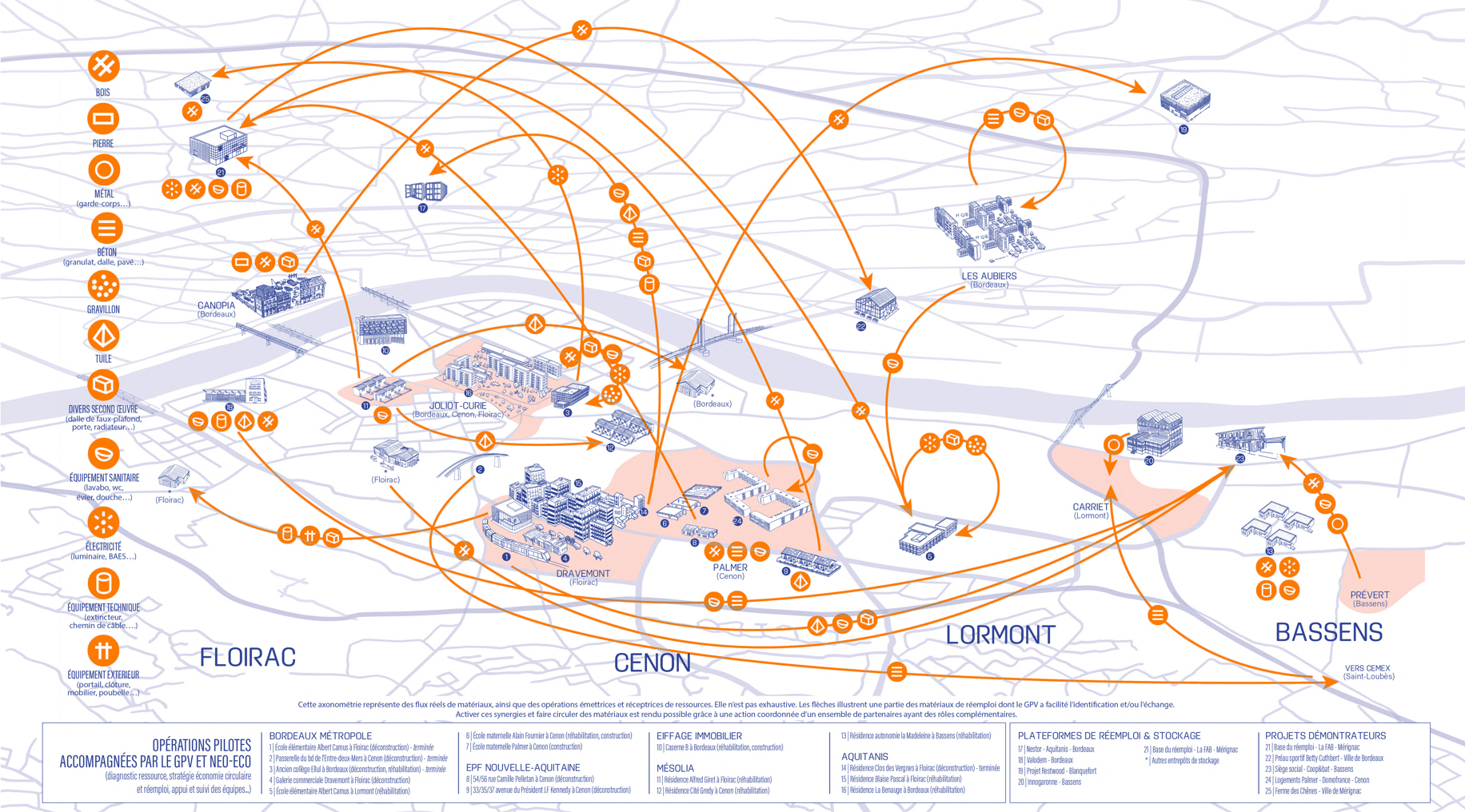 Depuis 2020, le GPV intervient comme « centre de ressources » sur l’économie circulaire dans le BTP pour la rive droite de Bordeaux Métropole. Nos actions visent à systématiser le réemploi, la réutilisation et le recyclage des matériaux issus de la déconstruction, notamment dans les 5 quartiers en renouvellement urbain et l’accompagnement de 16 opérations pilotes à ce jour, auprès de plusieurs maîtrises d’ouvrage.